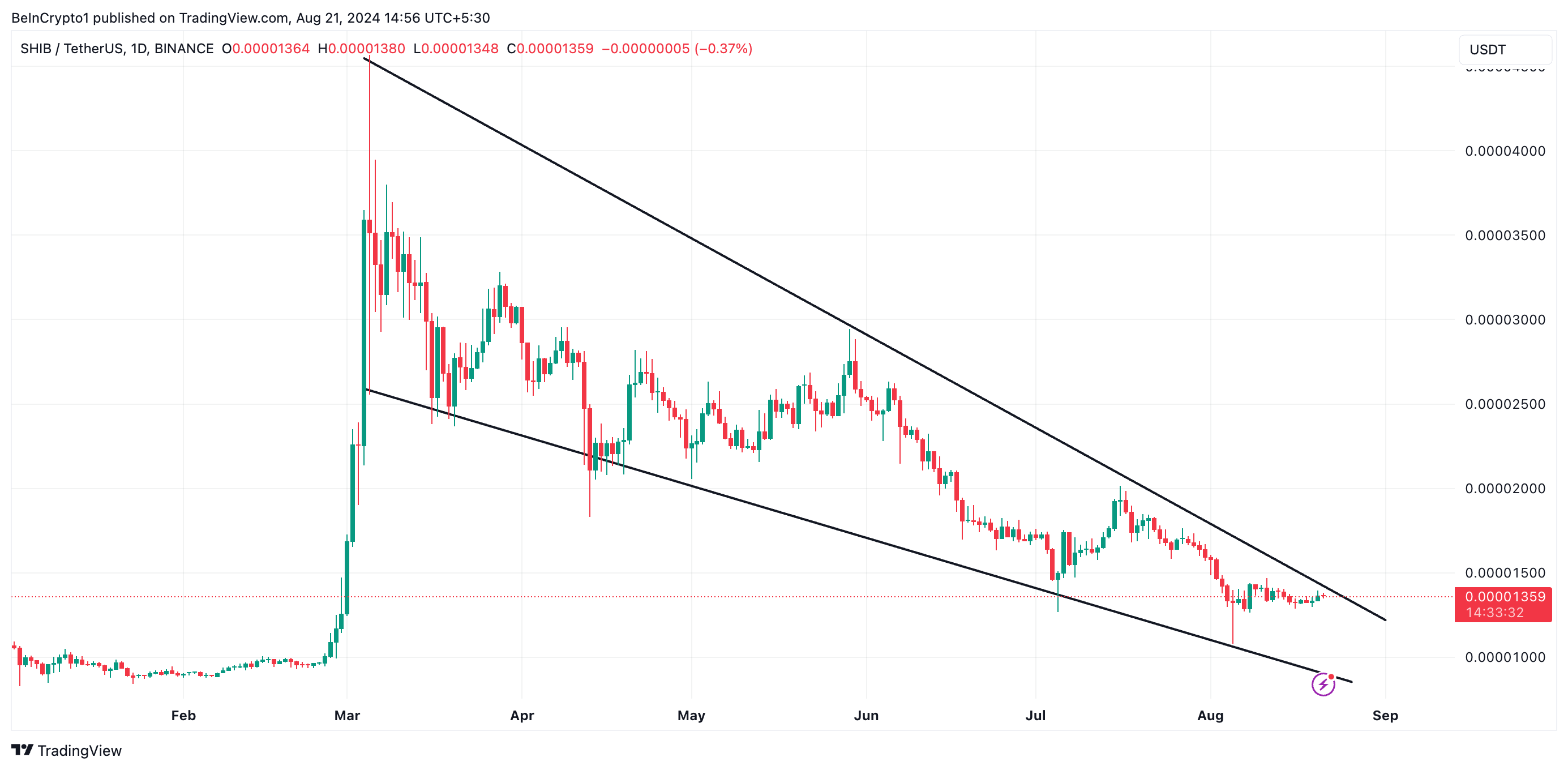 Siden den nåede et år-til-dato højdepunkt på $0.000035 den 5. marts, er SHIBs kurs støt faldet, hvilket har dannet et faldende kilemønster. Dette mønster udvikler sig, når et aktivs pris skaber en serie af lavere højder og lavere lavpunkter, der konvergerer og skaber en kileform.