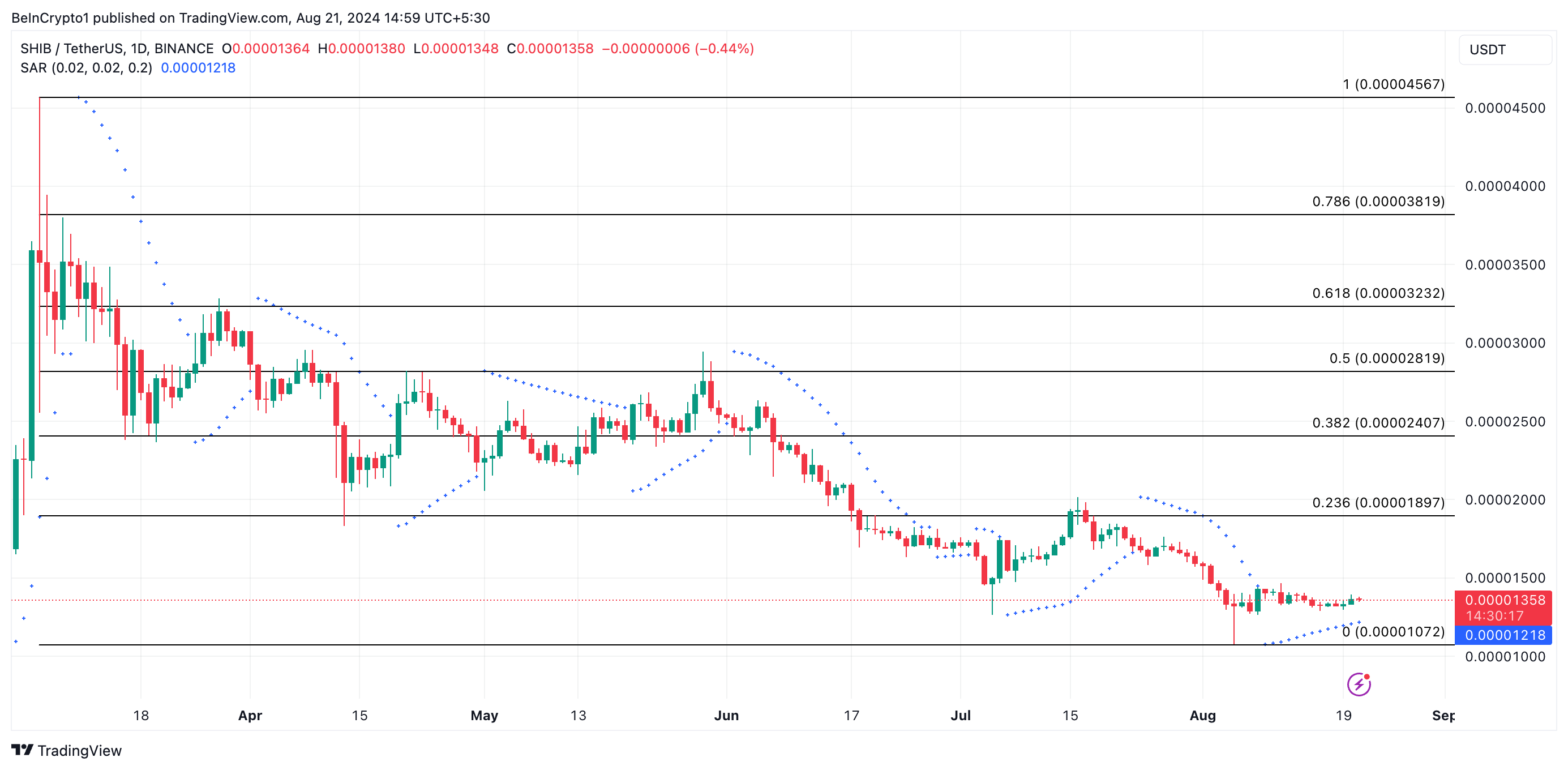 I øjeblikket handles SHIB til $0.000013, hvilket afspejler et fald på 24% over den seneste måned.