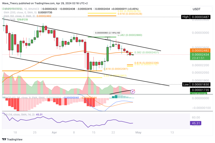 Shiba Inuhar for nylig brudt det kritiske støtteniveau på 50-dages EMA, der ligger på ca. $ 0,0000248, og søger i øjeblikket betydelig støtte på .382 Fib-niveauet, omkring $ 0,0000244. Dette niveau kan fungere som en platform for et bullish rebound, der potentielt retter sig mod 50-dages EMA-modstanden.