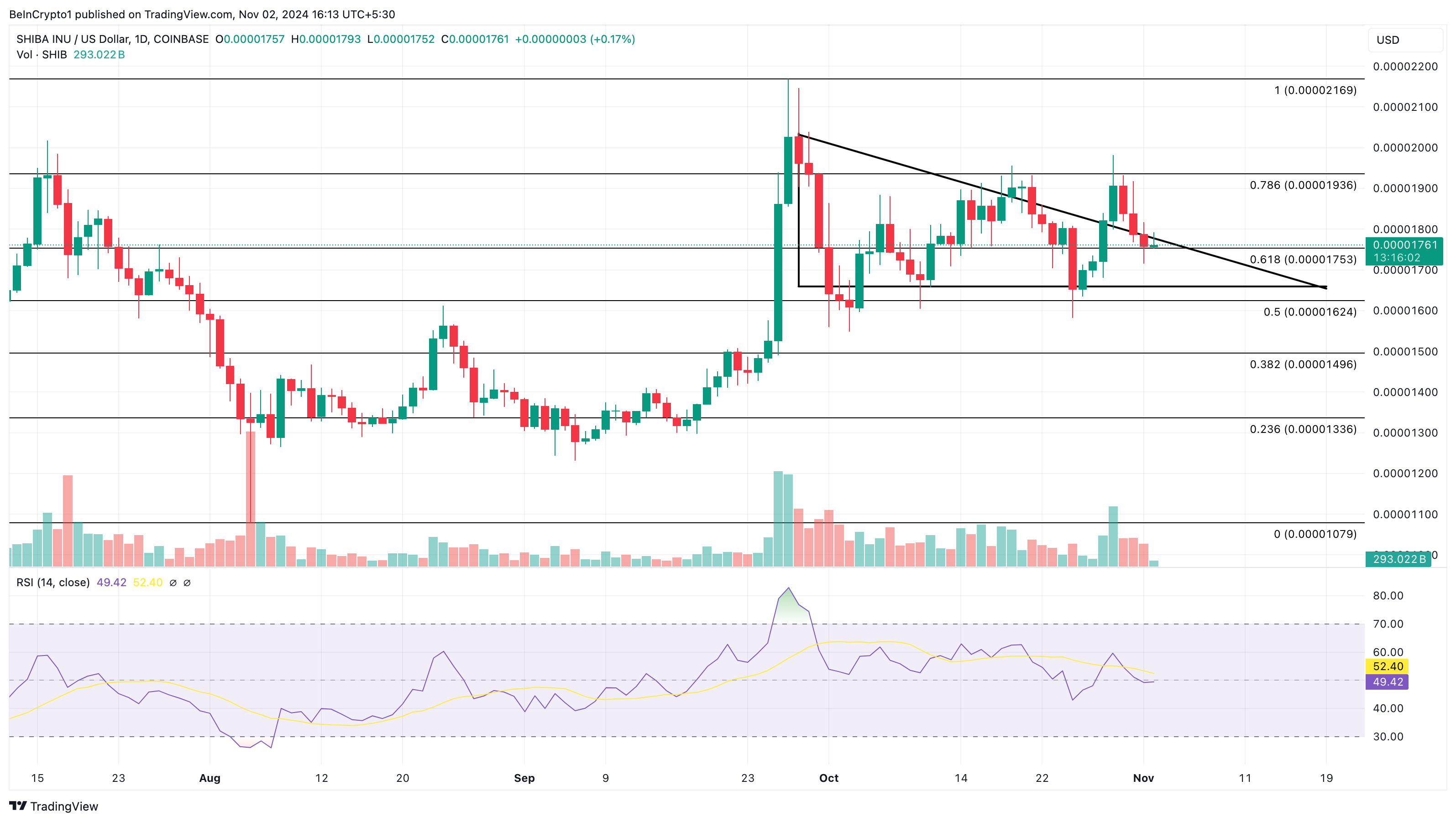 På det daglige diagram brød SHIB’s kurs ud af et nedadgående trekantmønster den 29. oktober. Dette udbrud ses ofte som et bullish signal, der antyder, at kursen potentielt kunne trende opad.