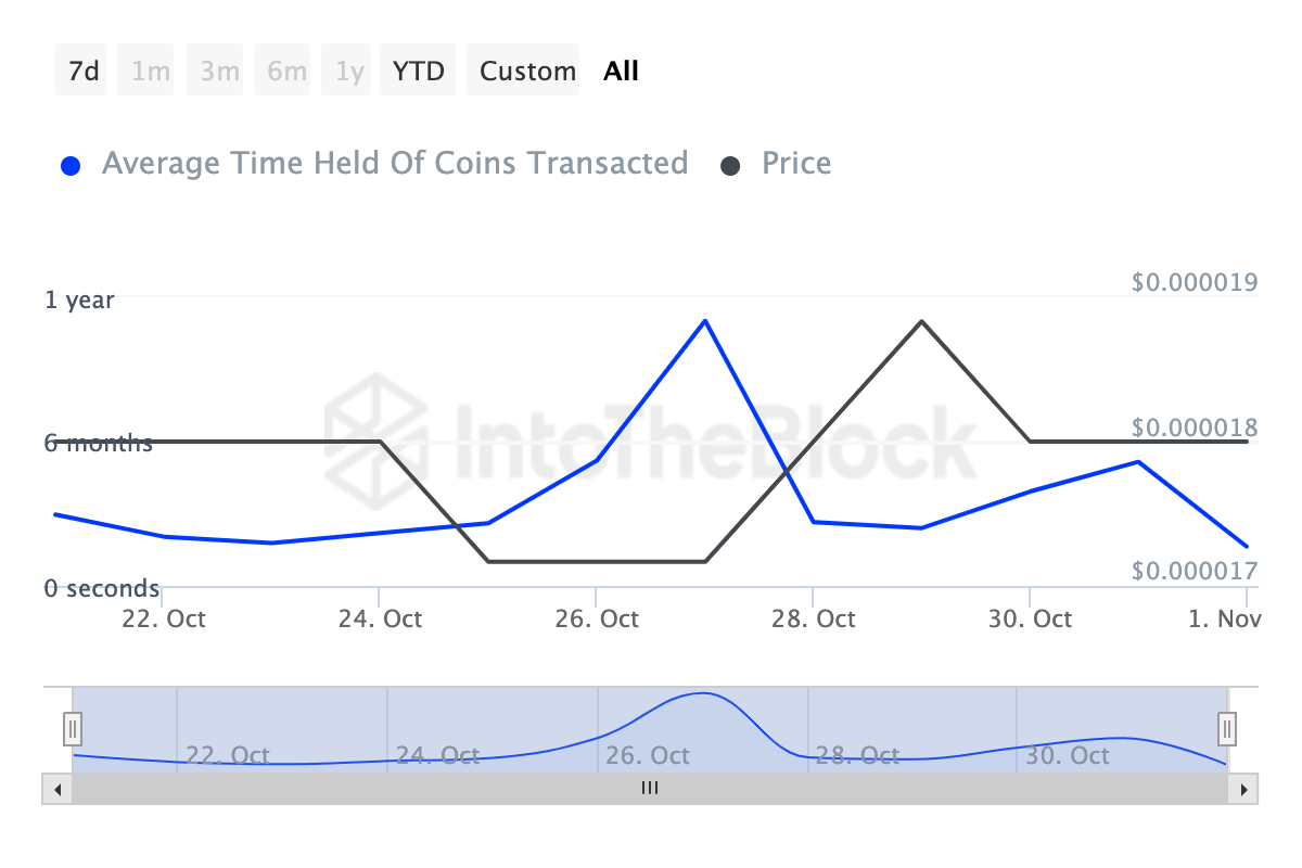 Desuden viser on-chain data fra IntoTheBlock et fald i Shiba Inu’s Coins Holding Time i løbet af den sidste uge. Denne måling afspejler den gennemsnitlige varighed, som SHIB coins holdes før de sælges.