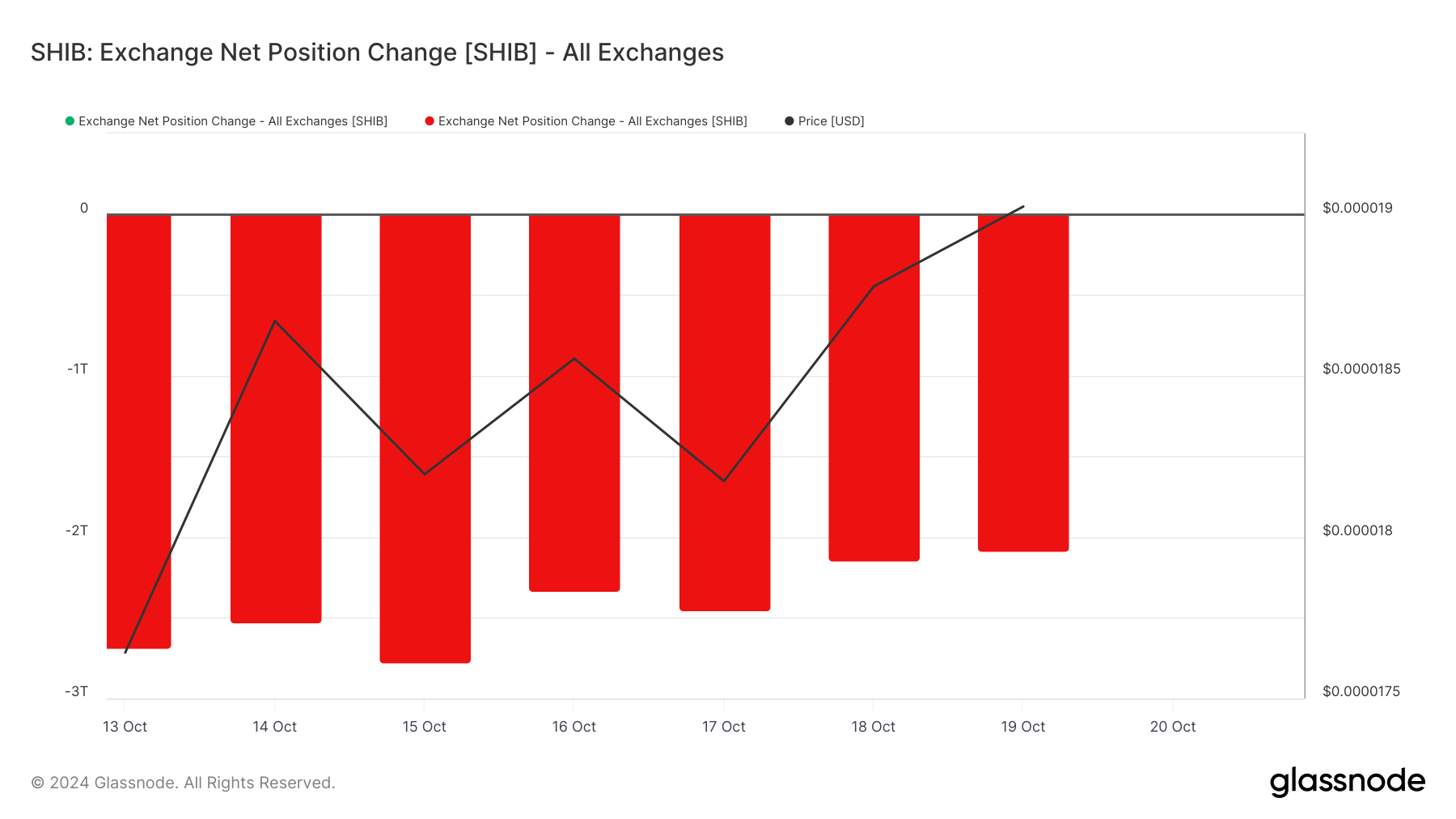 Data fra Glassnode viste, at SHIB-indehavere har trukket over 16 billioner tokens ud af børserne i de sidste syv dage. Til den nuværende kurs svarer dette til cirka $288 millioner.