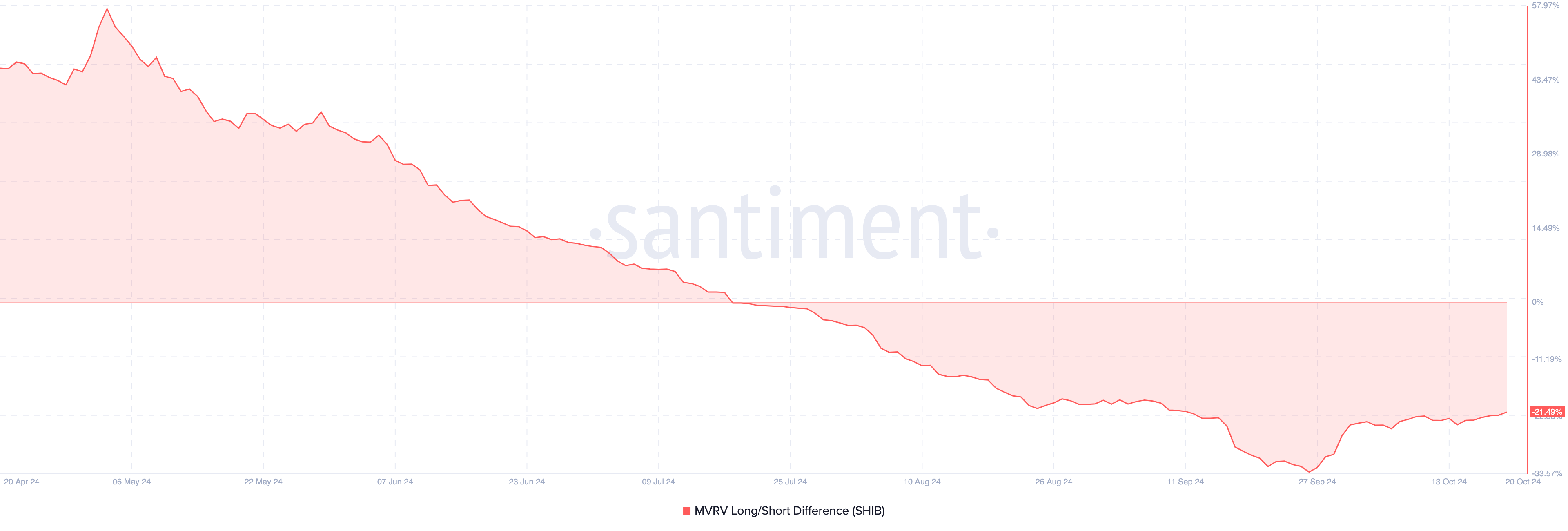 Men i øjeblikket er MVRV Long/Short Difference steget til -21,49%, hvilket antyder, at meme-coinen langsomt forlader den overvejende bearish fase. Skulle denne aflæsning fortsætte med at stige, så kan Shiba Inus kurs også følge trop.