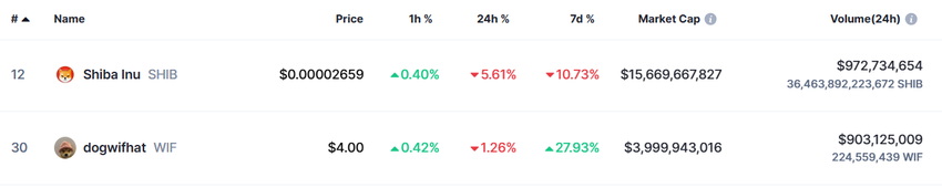 På trods af en markedsværdi på kun 4 milliarder dollars giver WIF betydelig konkurrence til SHIB med en markedsværdi, der er næsten fire gange større end WIF’s, og i alt 15,7 milliarder dollars. Den samlede omsætning i de sidste 24 timer for WIF er på ca. 903 millioner dollars, mens SHIB har volumen for 972 millioner dollars.