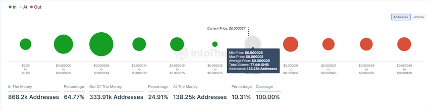 Stemningen vil sandsynligvis fortsætte, da en del af SHIB er ved at blive underskudsgivende. Mere end 77,44 billioner SHIB til en værdi af over 2,52 milliarder dollars er tæt på at miste rentabiliteten. De blev købt for mellem $0.00003100 og $0.00002500, og altcoinen er allerede tæt på at falde gennem det lavere interval.