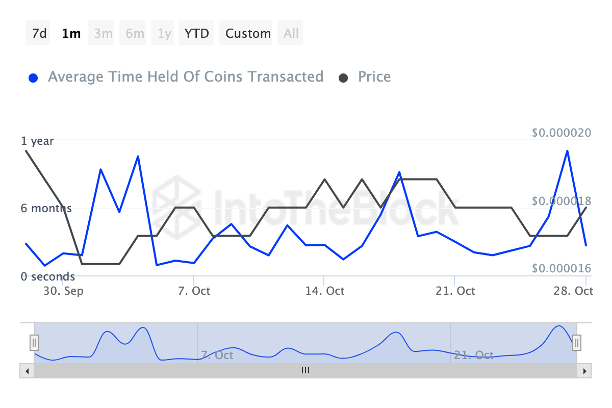Ifølge IntoTheBlock kunne kryptovalutaen klatre på denne måde på grund af et fald i salgspres. For eksempel er Coins’ Holding Time steget med 30% inden for de sidste syv dage.