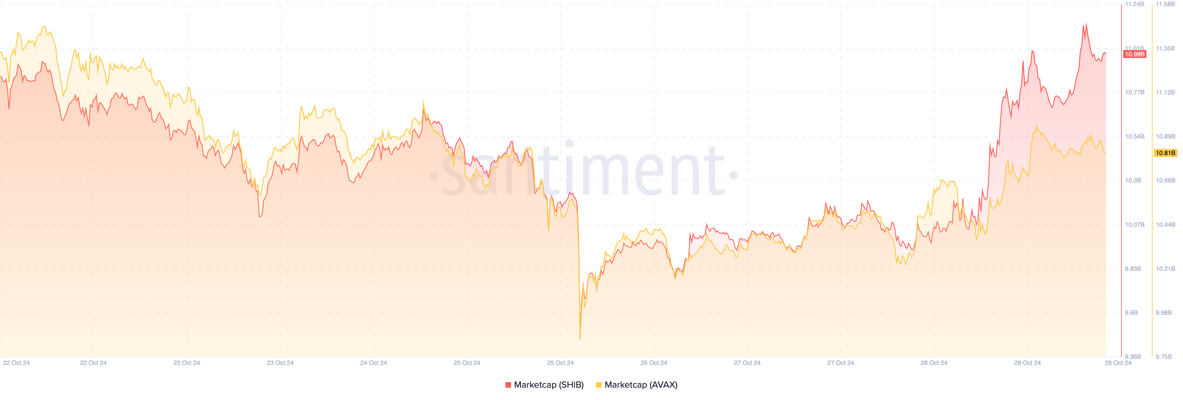 Shiba Inus (SHIB) markedsværdi har i dag overgået Avalanche (AVAX) efter en kursstigning på 7% de sidste 24 timer. Denne udvikling betyder, at Shiba Inu-kryptovalutaen nu har en markedsværdi på 10,98 milliarder dollars, hvilket gør den til den 12. mest værdifulde kryptovaluta på markedet.