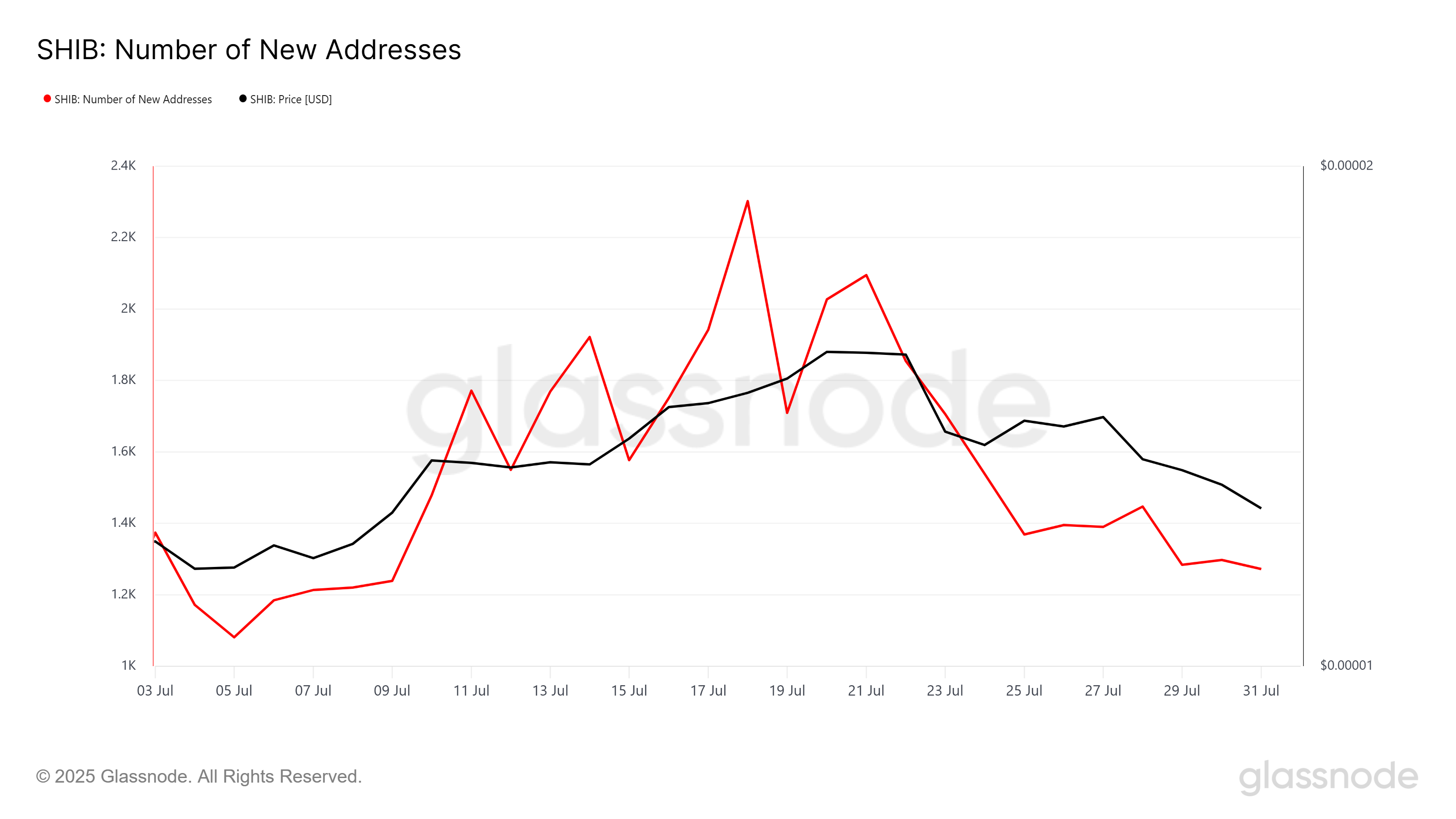 I øjeblikket ligger Shiba Inus kurs på $0.00001210, nede med 21% over de sidste 10 dage. Det nylige fald er primært drevet af det skarpe fald i nye investorer, der træder ind på markedet.