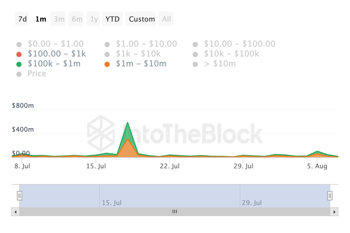 Ifølge data fra IntoTheBlock har den seneste måned vist et dagligt fald i store transaktioner med SHIB. Til sammenligning er det daglige antal SHIB-transaktioner på mellem $100.000 og $1.000.000 faldet med 46% over de seneste 30 dage. Yderligere er transaktioner på mellem $1.000.000 og $10.000.000 faldet med 64% i samme periode.