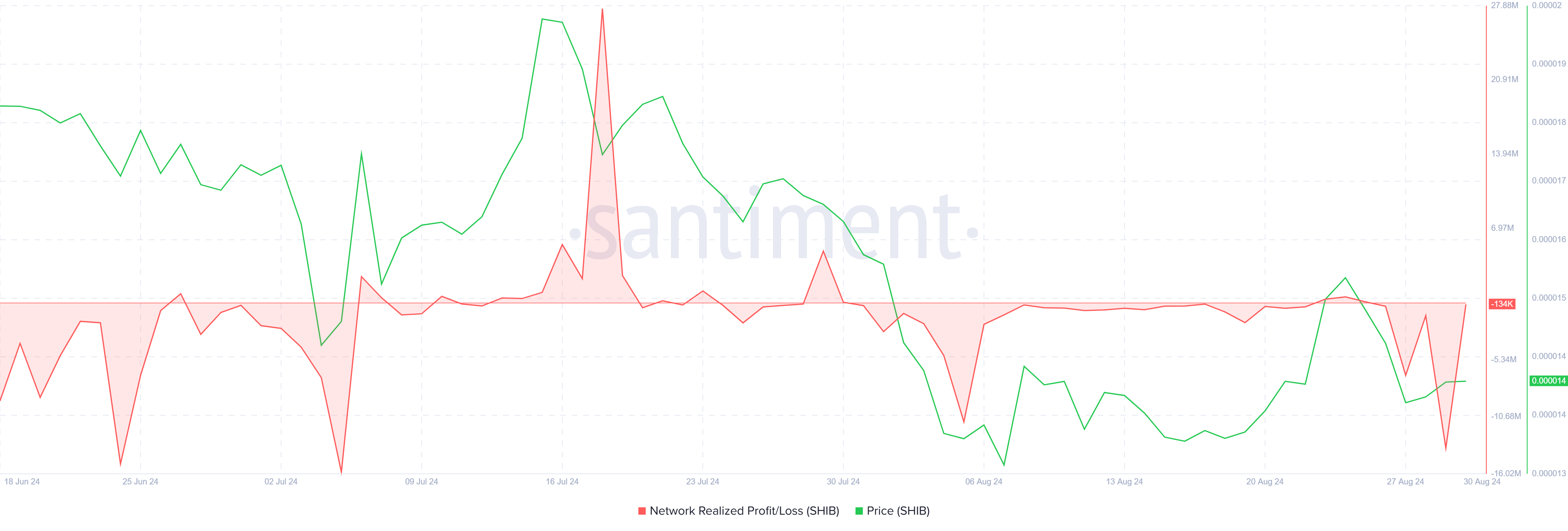 Shiba Inu’s kurs’ bestræbelser på at undslippe bearishness kan møde nogle udfordringer. I de seneste 24 timer har en kombination af grådighed og panik udløst en bølge af pludselige salg. Dette salg resulterede i betydelige tab, med investorenes Realized Loss-indikator, der nåede over $13,5 millioner.