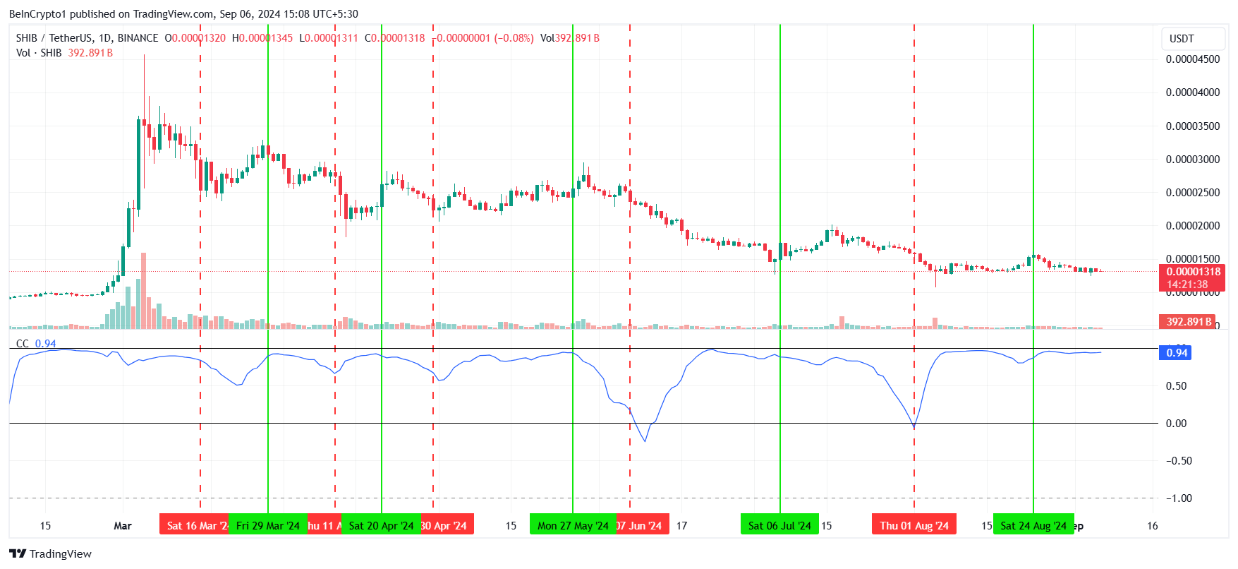 Shiba Inus kursbevægelser har været tæt knyttet til Bitcoin, med en positiv korrelationskoefficient på 0.94. Denne stærke korrelation hjælper i øjeblikket SHIB med at undgå et betydeligt fald.