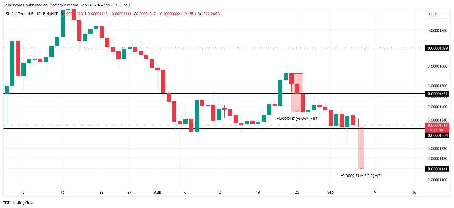 Men, hvis korrelationen mellem SHIB og Bitcoin svækkes, kan meme coinen stå over for et betydeligt fald. Et fald under $0.00001304 kunne udløse et fald på 13%, sende SHIB til $0.00001141, hvilket markerer den laveste pris i seks måneder og invaliderer enhver bullish momentum.