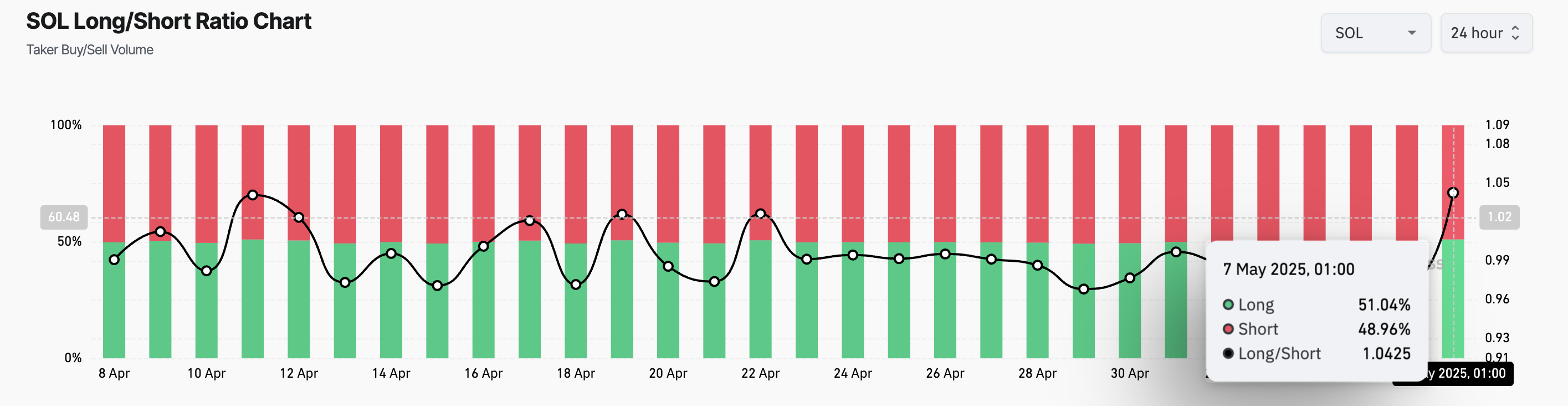 SOL’s futureshandlende har udtrykt optimisme ved at øge deres efterspørgsel efter lange positioner. Ifølge Coinglass er coinens long/short-forhold på et månedligt højdepunkt på 1,04, hvilket signalerer en præference for lange positioner blandt dens futuresmarked deltagere.