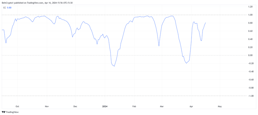 Dette skyldes den høje korrelation, som de to kryptovalutaer deler. Efter adskillelsen i marts blev korrelationen mellem de to aktiver stærkere, og den ligger i øjeblikket på 0,8.