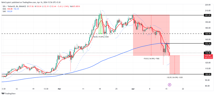 Hvis de førnævnte bearish signaler dikterer prisaktionen, kan Solanas pris korrigeres betydeligt. Altcoin handles til $132 og vil udvide den 34% korrektion, der er noteret siden begyndelsen af måneden, med yderligere 24% for at bringe SOL ned til $100.