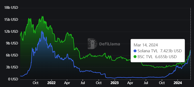 I mellemtiden er den samlede værdi af aktiver, der er låst på Solana-netværket, også på et toårigt højdepunkt på næsten 4 milliarder dollars. DeFi-analytiker Patrick Scott påpegede en interessant kendsgerning. Solana DeFi TVL, inklusive flydende staking, vendte Binance Smart Chain (BSC) for første gang i løbet af den sidste dag.