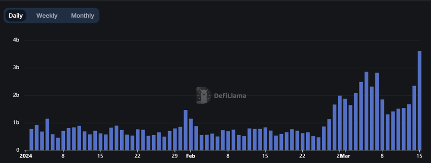 Alene i løbet af de sidste 24 timer har den daglige transaktionsvolumen oversteget imponerende 3,6 milliarder dollars, hvilket er et nyt rekordniveau.