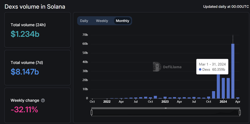 På trods af de seneste tilbageslag har trenden med meme-mønter unægtelig øget handelsvolumen på Solanas decentrale børser (DEX’er). Data fra DeFiLlama afslører, at Solanas DEX’er nåede en kumulativ volumen på 60,35 milliarder dollars i marts 2024. Dette tal overgår det højeste nogensinde fra december 2023.