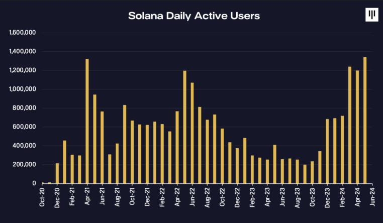 “I maj 2024 tegnede Solana sig for 85% af alle nye tokens, der vises på DEX’er, op fra 50% for et år siden. Denne stigning i Solana-baserede tokens afspejler dens styrke inden for detailbrug, drevet af memecoin-aktivitet,” bemærker rapporten.