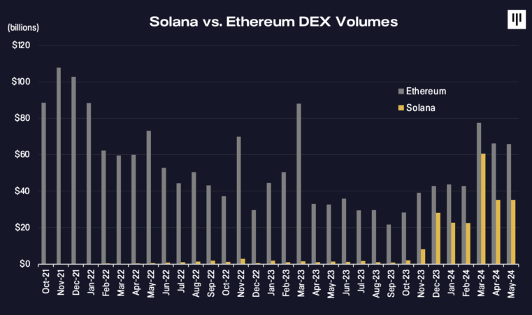 Bemærkelsesværdigt er Solanas andel af DEX-volumen steget med mere end 24% siden 2021, en forbløffende vækst, der så den fange over 60% af trinvis DEX-volumen alene i maj 2024.