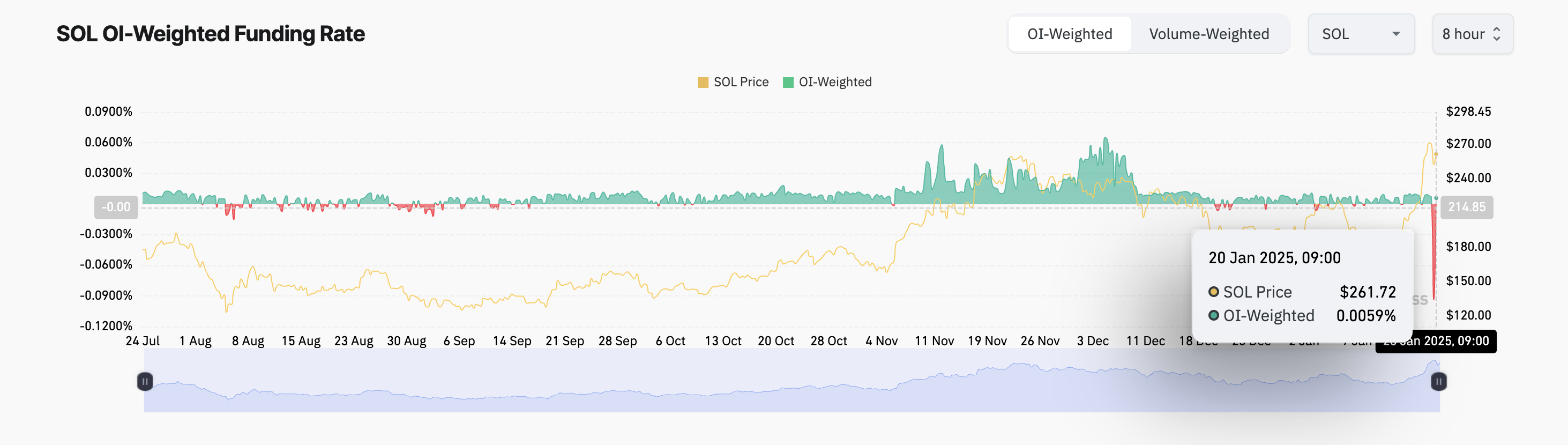 Men markedsstemningen har ændret sig. SOL’s funding rate er nu steget til 0,0059%, hvilket indikerer, at futures-handlende begynder at tage long-positioner på altcoinen.