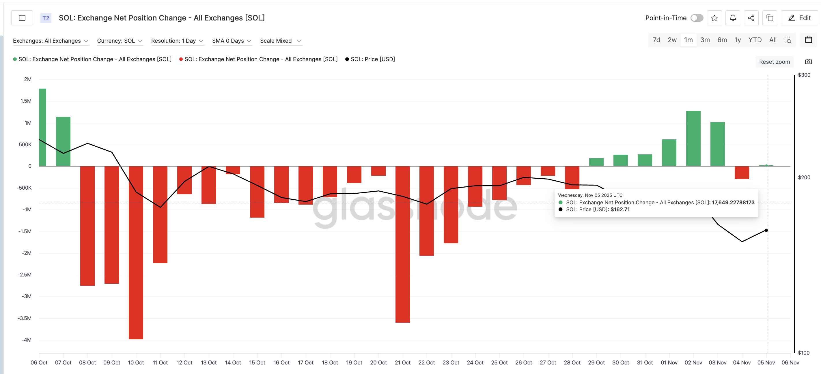 Den 5. november havde tallet vendt til 17,649 SOL, der flød tilbage ind — et skift på 106% fra udstrømninger til indstrømninger, hvilket signalerer fornyet salgspres.