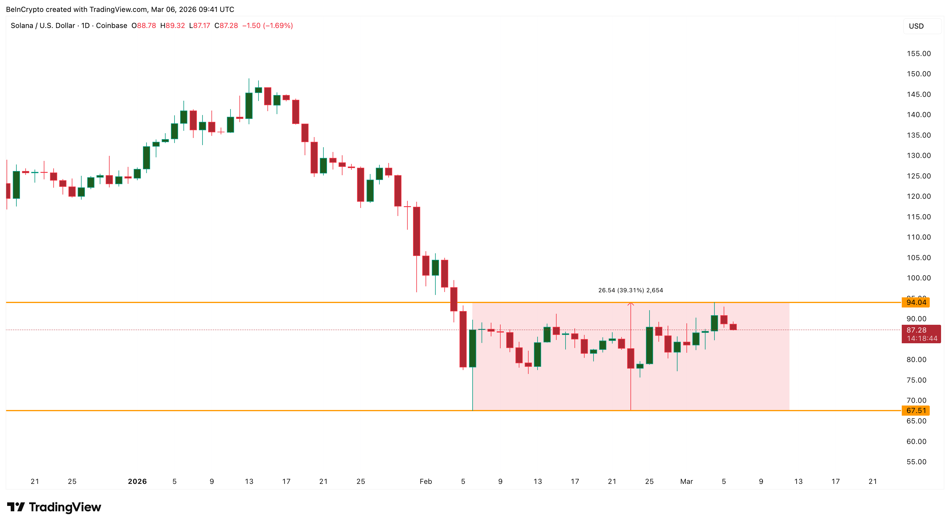 Kursgrafen for Solana antyder svaghed ved første øjekast. Tokenet er stadig nede med cirka 10 % måned-til-måned, hvilket afspejler den generelle afmatning på kryptomarkedet. Men, det tal skjuler en vigtig detalje. Mellem 6. februar og 4. marts kom Solana stærkt tilbage. Aktivet steg fra næsten $67 til $94, svarende til en stigning på næsten 40 % på under en måned.