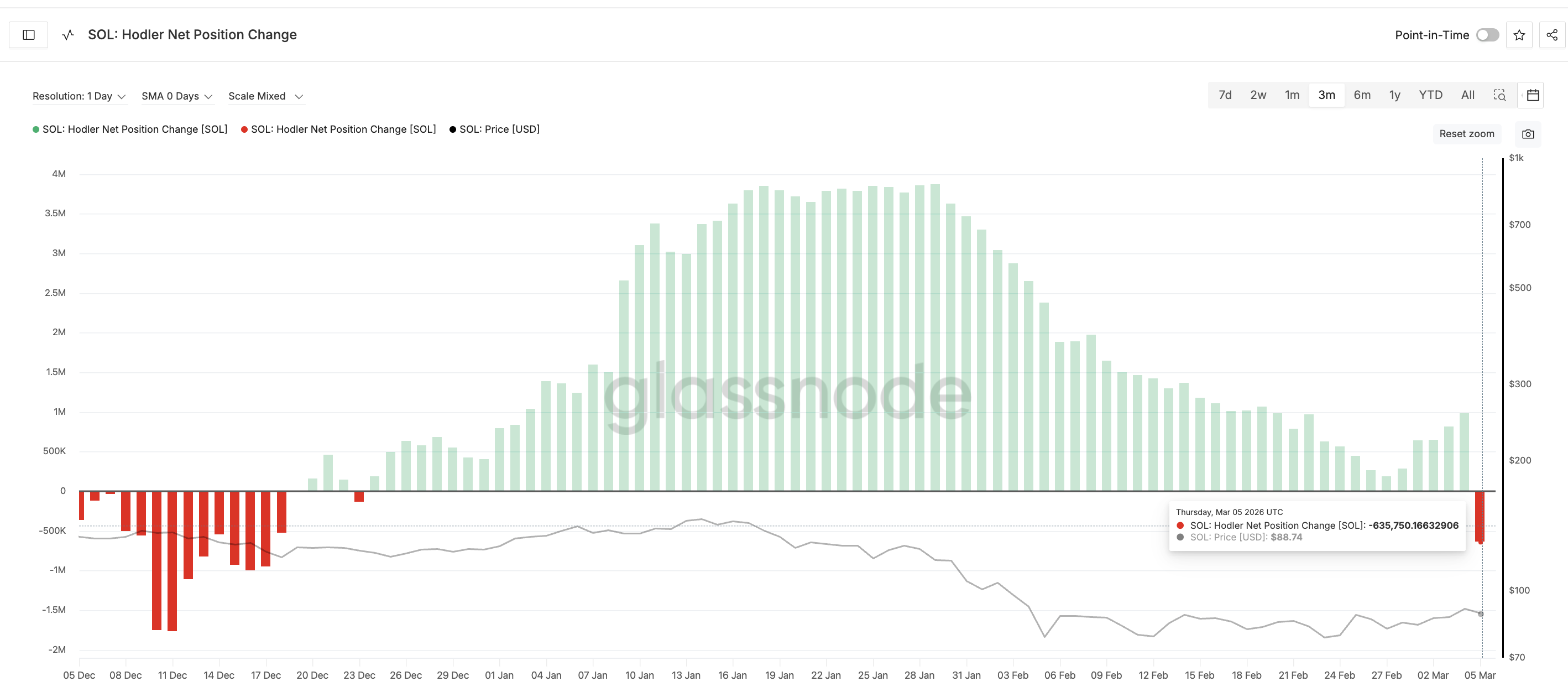 Målingen har for nylig skiftet til negativt, cirka –635.750 SOL, hvilket angiver, at det seneste salg nu overstiger den stabile akkumulering, der er set den sidste måned.