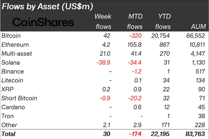 Solana (SOL) blev hårdest ramt, da kryptovaluta-investeringsprodukter kun så beskedne indstrømninger på $30 millioner sidste uge. Ethereum registrerede kun $4,2 millioner i indstrømninger, mens Bitcoin førte an med $42 millioner.