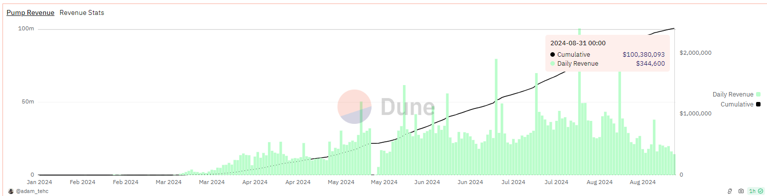 Data fra Dune Analytics afslører, at Pump.funs indtægter har krydset grænsen på 100 millioner dollars, med næsten 2 millioner tokens lanceret på platformen. Denne præstation skete omkring otte måneder efter dens lancering på Solana i januar 2024, efterfulgt af integrationen af Blast kort efter dens mainnet blev lanceret i februar.