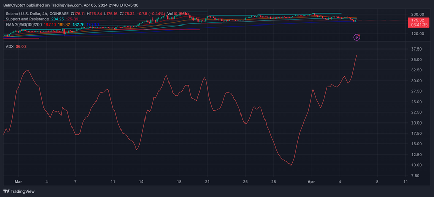 Desuden viser det gennemsnitlige retningsindeks (ADX) på Solana et stærkt billede af prisen. Med en aktuel aflæsning på 36 indikerer det en solid bearish trend.