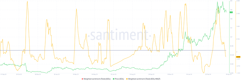 Den stigende pessimisme blandt SOL-investorer underbygger yderligere den manglende generelt manglende optimisme. Det kan ses på det fald, der er observeret i det vægtede sentiment. Denne måling registrerer et fald under nullinjen, hvilket tyder på, at bearishness dominerer investorerne.