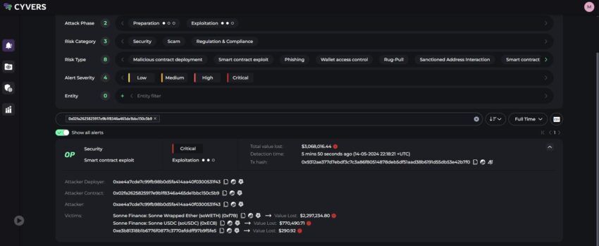 I første omgang rapporterede Cyvers, at 3 millioner dollars var blevet stjålet fra Sonnes USD Coin (USDC) og Wrapped Ethereum (WETH)-kontrakter på Optimism-kæden. Men situationen blev hurtigt forværret. Inden for 30 minutter opdaterede Cyvers tabsestimatet til 20 millioner dollars.