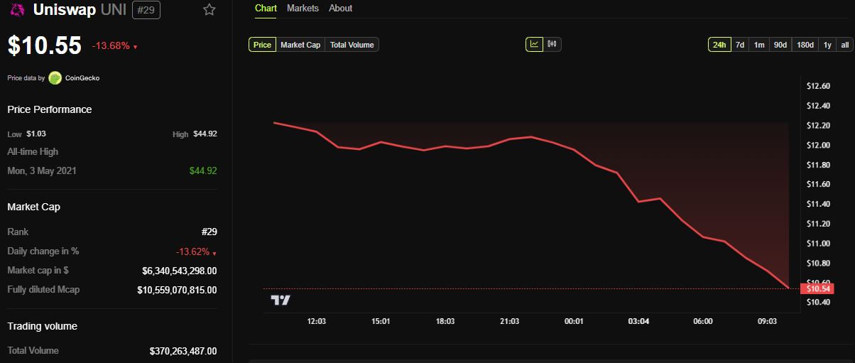 Opgraderingen kan give en stærkere grundlag for Uniswap, hvilket potentielt kan øge markedets tillid og dermed kursen på UNI. På trods af denne forventning viser BeInCrypto-data, at Uniswaps UNI-token blev handlet til $10,55. Det er faldet med næsten 14% siden mandagens session åbnede, relativt dæmpet af hypen omkring opgraderingen.