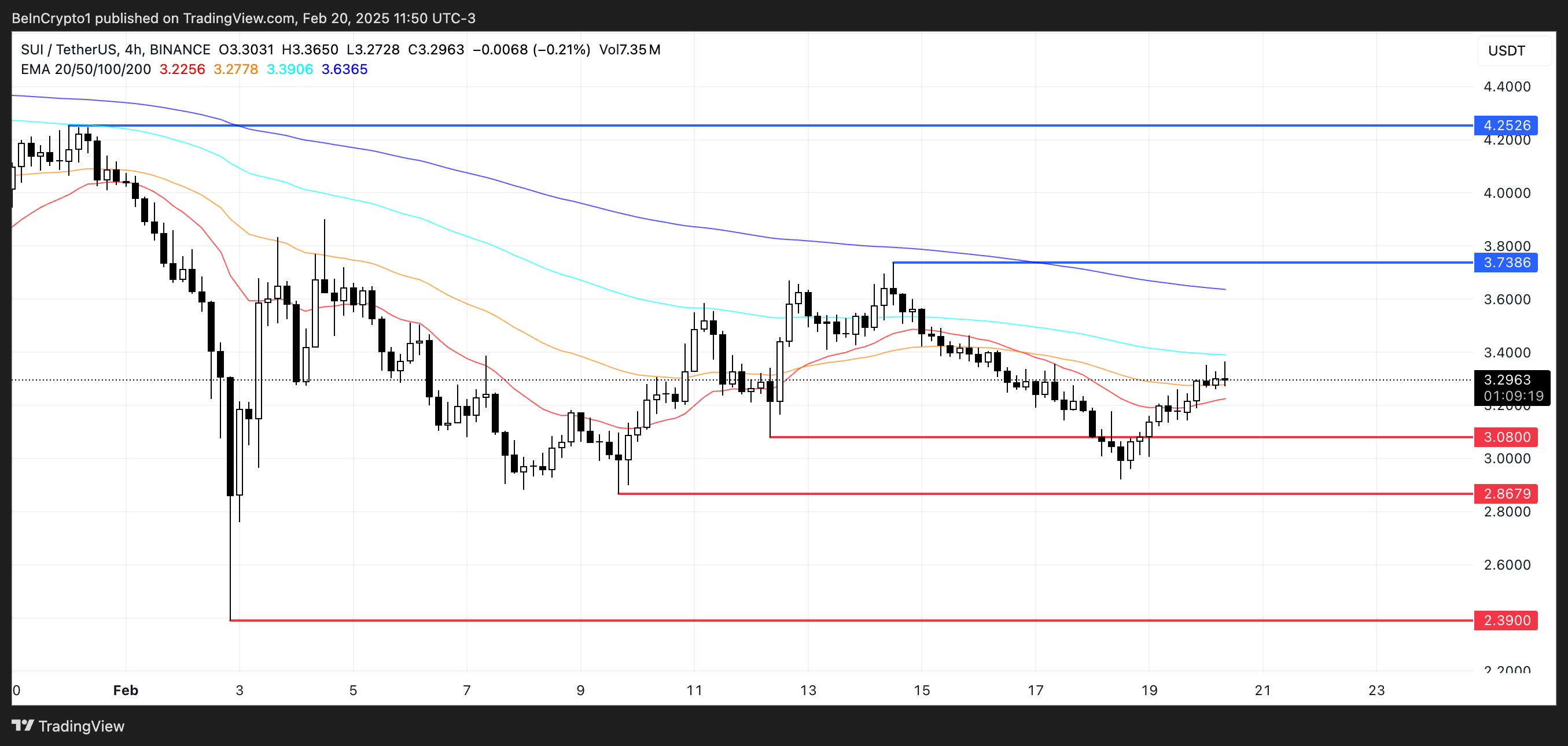 Men hvis det opadgående momentum aftager, og de kortsigtede EMA’er ikke formår at krydse over de langsigtede, kan den bearish trend fortsætte. I dette scenarie kan SUI genteste støttenzoner omkring $3,08 og $2,86.