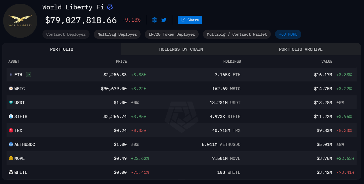 Ikke desto mindre har WLFI’s “Strategic Reserve” intet at gøre med den føderale regering, og investorer bør være opmærksomme. I dag inkluderer WLFI’s portefølje over 20 forskellige kryptovalutaer. Størstedelen af beholdningerne er i Ethereum, Wrapped Bitcoin, USDT, Tron’s TRX og MOVE.