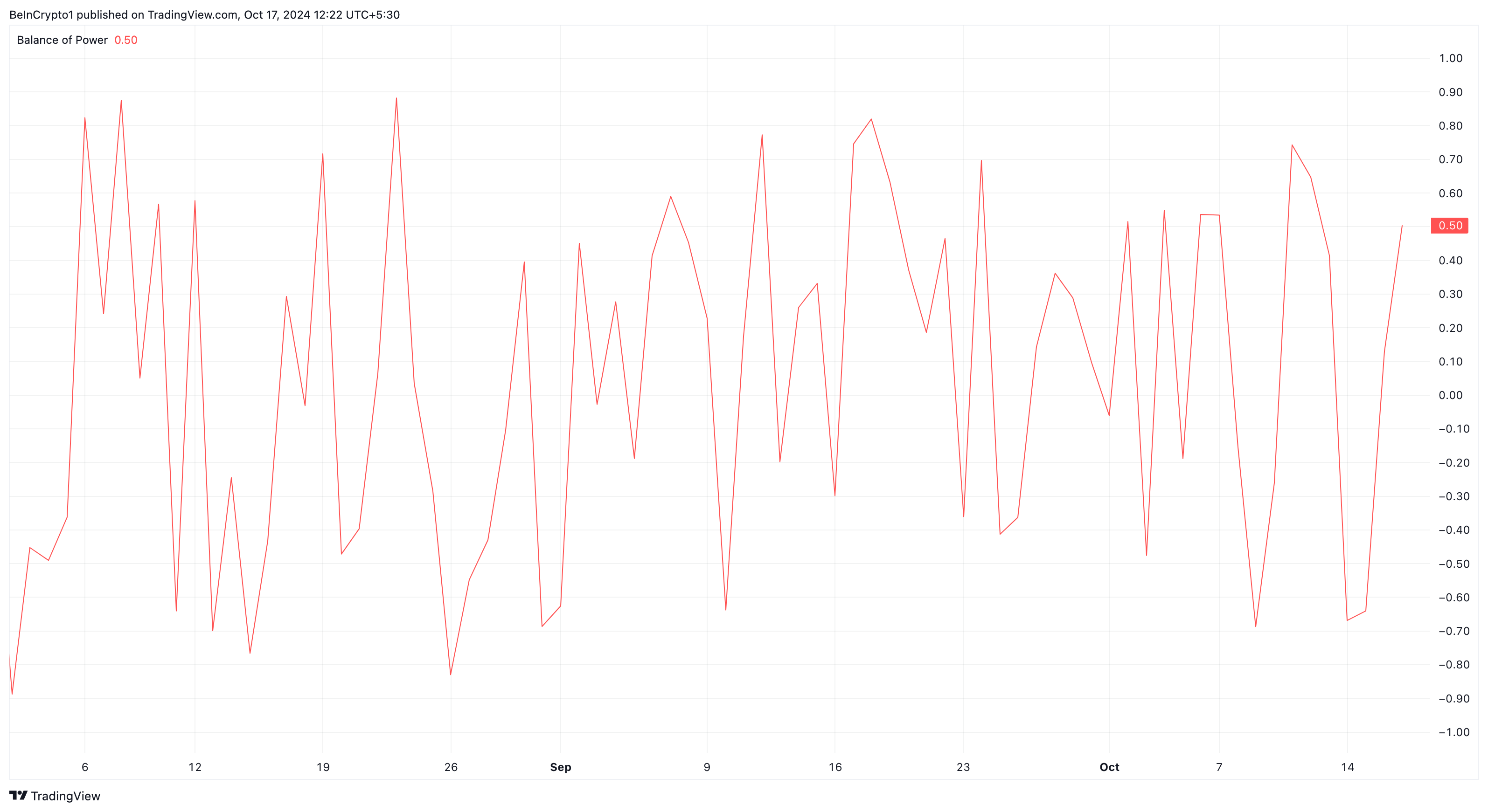 I overensstemmelse med dette udsyn er Balance of Power (BoP), som måler styrken af købere versus sælgere, steget. Når BoP falder, indikerer det, at sælgere (bears) dominerer, hvilket ofte fører til et kursfald.