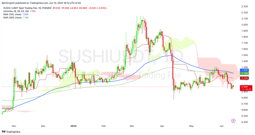 Prisen på SUSHI viser klare bearish tegn på det daglige diagram. Det har gentagne gange testet både 200 EMA (grøn) og 100 EMA (blå), mens den bevæger sig inden for Ichimoku Cloud.