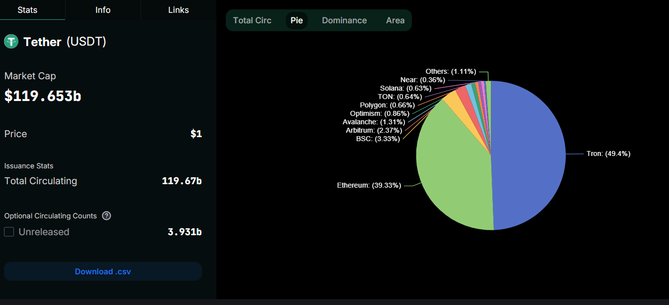 Over det sidste årti er USDT vokset til at blive den tredjestørste kryptovaluta målt på markedsværdi, kun overgået af Bitcoin og Ethereum. Data fra DeFillama viser, at aktivet har en markedsværdi på næsten $120 millioner, og kontrollerer omkring 69% af stablecoin-markedet.