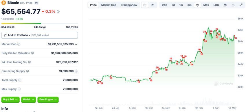 På trods af disse spekulationer har Bitcoins pris stabiliseret sig mellem 64.000 og 66.000 dollars i løbet af de sidste 24 timer. I sidste uge svingede BTC mellem 60.000 og 62.000 dollars indtil offentliggørelsen af amerikanske inflationsdata. BeInCrypto rapporterede et spring i Bitcoins pris fra $62.000 til $66.000 efter offentliggørelsen af inflationsdata i april, som tyder på, at inflationen måske er ved at aftage.