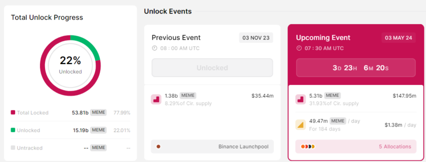 I mellemtiden forbereder Memecoin sig på et betydeligt token-unlock den 3. maj 2024, med 5,31 milliarder MEME-tokens, til en værdi af ca. 147,95 millioner dollars. Strukturen er som følger: