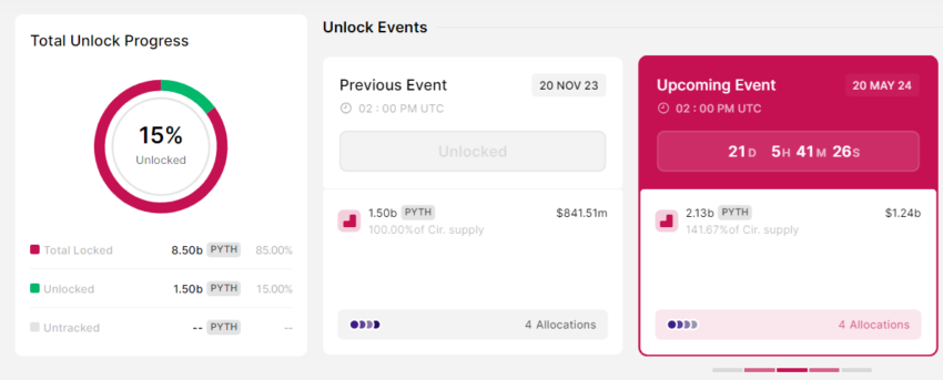 Pyth Network går forrest og planlægger at frigive 2,13 milliarder PYTH-tokens den 20. maj, til en værdi af ca. 1,24 milliarder dollars. Denne frigivelse er opdelt i flere kategorier: