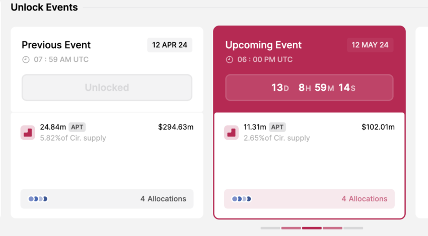 Aptos har planlagt en frigivelse af 11,31 millioner APT-tokens den 12. maj 2024, til en samlet værdi af 102,01 millioner dollars. Detaljerne i dette unlock inkluderer: