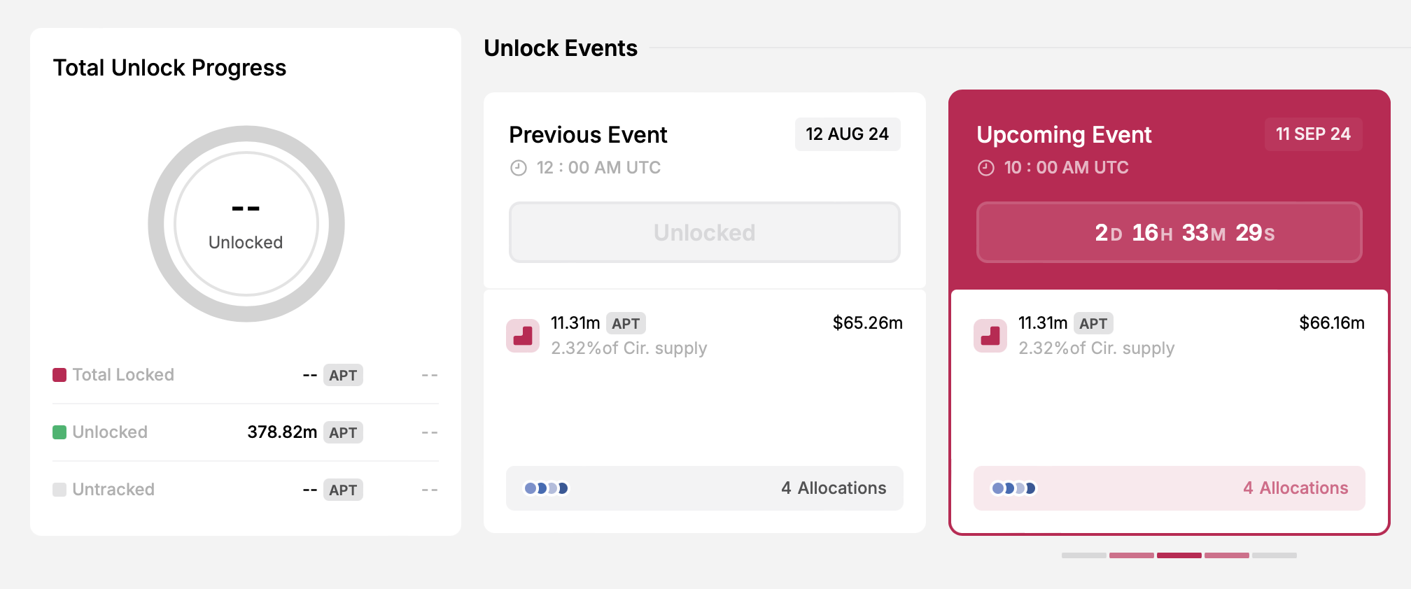 En stor del af APT tokens forbliver låst. Den 11. september vil projektet distribuere 11,31 millioner APT tokens til fællesskabsmedlemmer, kernebidragsydere og investorer.