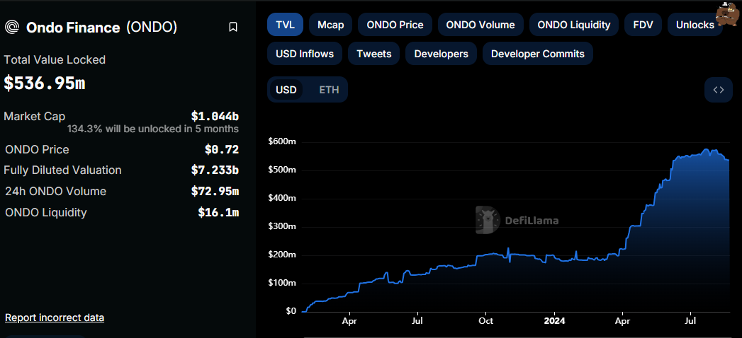 Imens er det afgørende at fremhæve Ondo Finance (ONDO) som en førende udbyder af tokeniserede amerikanske statsobligationer. Ifølge data fra DefiLlama overstiger den samlede værdi låst (TVL) på ONDO 536 millioner dollars, hvilket repræsenterer kontantækvivalente produkter. Dette positionerer ONDO som en nøglespiller i det voksende tokeniserede finanssektor, der tilbyder en bro mellem traditionelle aktiver og decentraliseret finansiering.