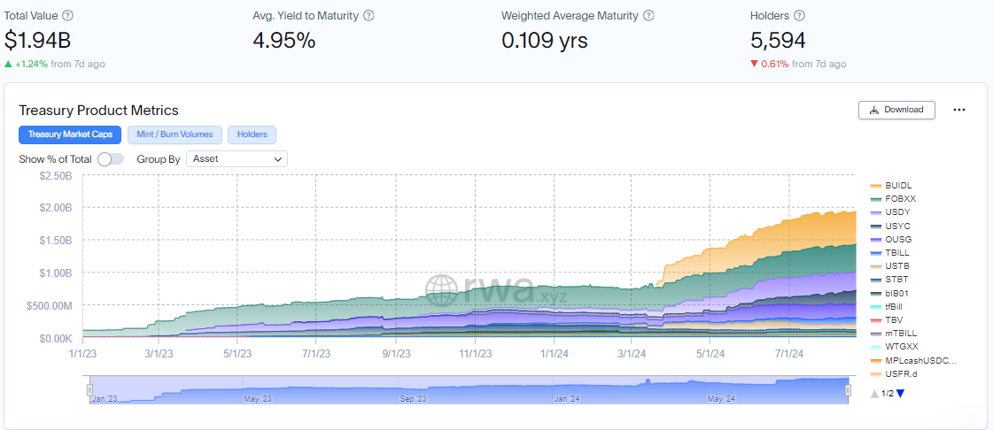 Faktisk har markedet for tokeniserede amerikanske statsobligationer oplevet betydelig vækst i 2024. Data fra RWA.xyz viser, at dette segments samlede værdi er vokset fra 726,23 millioner dollars til 1,94 milliarder dollars i år.