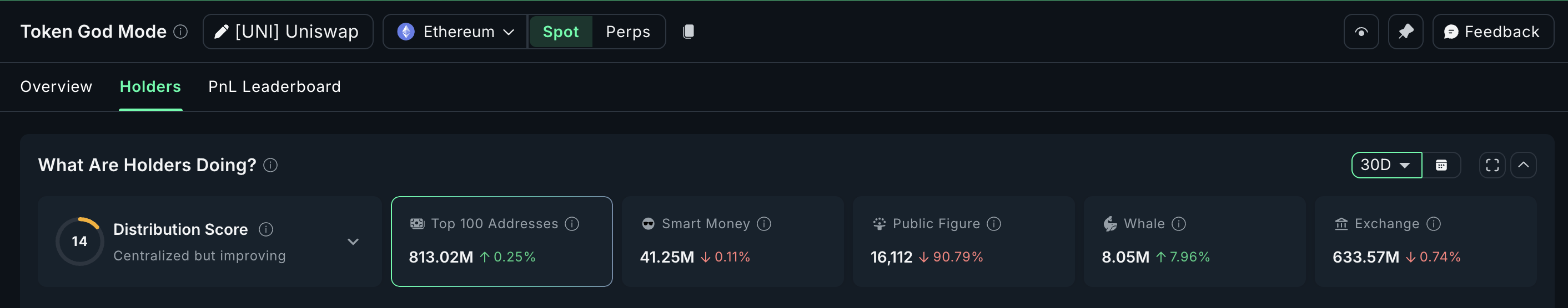 Derudover har to store investorgrupper stille og roligt øget deres eksponering i løbet af den 30-dages periode. Kryptohvalers wallets, som holder mellem 100.000 og 1 million UNI, udvidede deres beholdning med 7,96% til nu 8,05 mio. UNI. Samtidig tilføjede mega-kryptohvaler, der repræsenterer de 100 største adresser, 0,25%, så den samlede bunke nu er 813,02 mio. UNI.