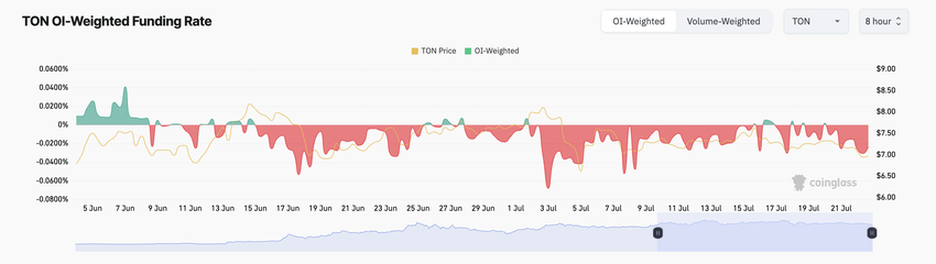Den konstante nedgang i TONs værdi i løbet af den anmeldte uge har fået mange futureshandlere til at vælge short positioner. Dette kan ses fra altcoinens overvejende negative finansieringsrate siden begyndelsen af juli. I øjeblikket er TONs finansieringsrate på tværs af kryptovalutabørser -0,023%.