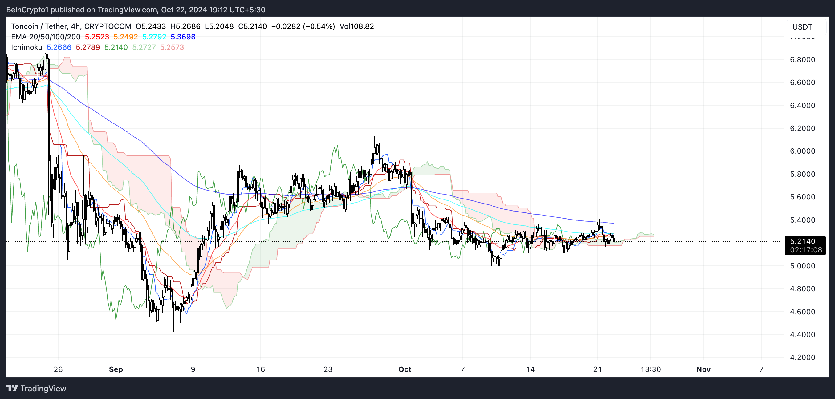 Desuden er de glidende gennemsnit på vej nedad, og prisen forbliver under disse linjer, hvilket yderligere bekræfter det herskende bearish sentiment. Med skyen, der giver modstand opad og prisen konsekvent svævende omkring $5,2-niveauet, ser TON ud til at være i en konsolideringsfase.