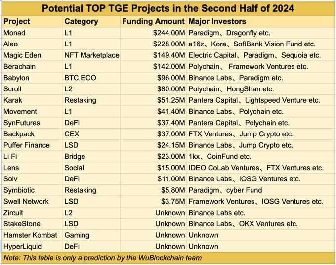 Den berømte kryptojournalist Colin Wu forudsiger, at flere nøgleprojekter fra forskellige sektorer er klar til deres token generation events (TGE’er) i anden halvdel af 2024.